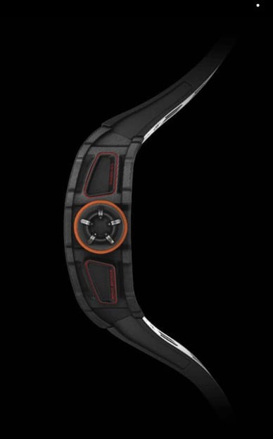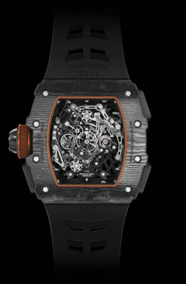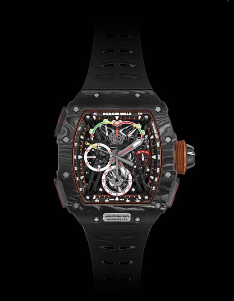 The RM 50-03 McLaren F1 ultra-light split-seconds tourbillon chronograph is the epitome of a perfect chronograph: it combines a tourbillon escapement with a split-seconds device. This requires perfect energy transfer and reduction of friction, so we obtained excellent balanced torque and ideal effects by improving the tooth shape of the spring gear teeth.
